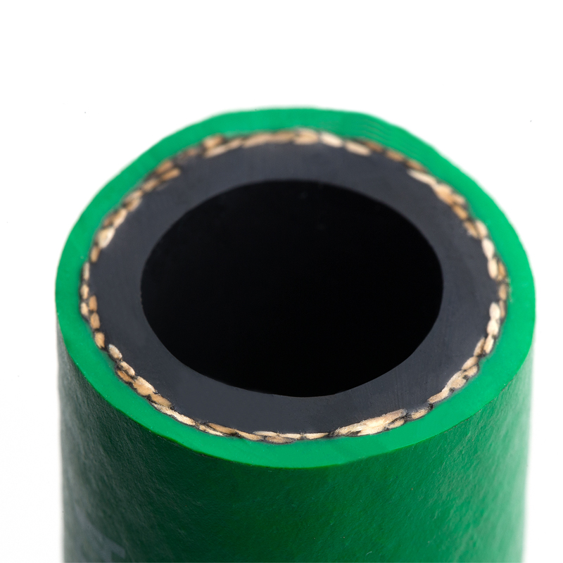 增強(qiáng)層:單層高強(qiáng)度合成纖維編織層,編制角度使得軟管具備高耐曲撓性,并對(duì)接頭有抱緊度,不必再使用卡箍緊固。